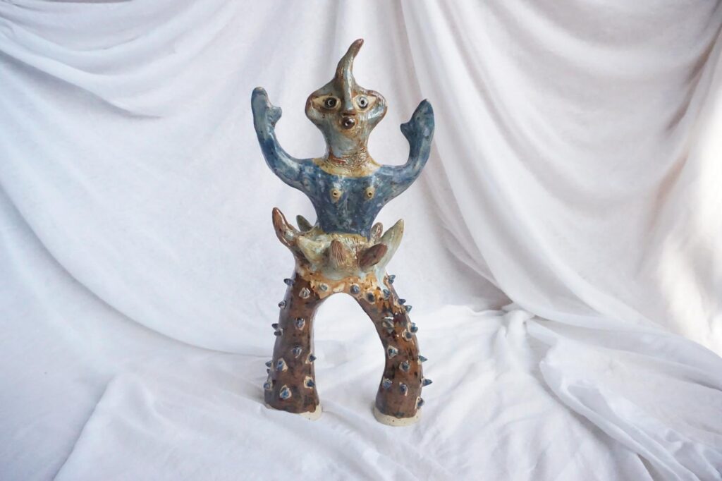 These imperfect, vital figures reclaim their right to exist, to belong to a world without fixed borders, where hybridity becomes a language and a possibility of freedom. Her sculptures intertwine with illustration in a hybrid narration made of clay, monotype, and pastel on paper.