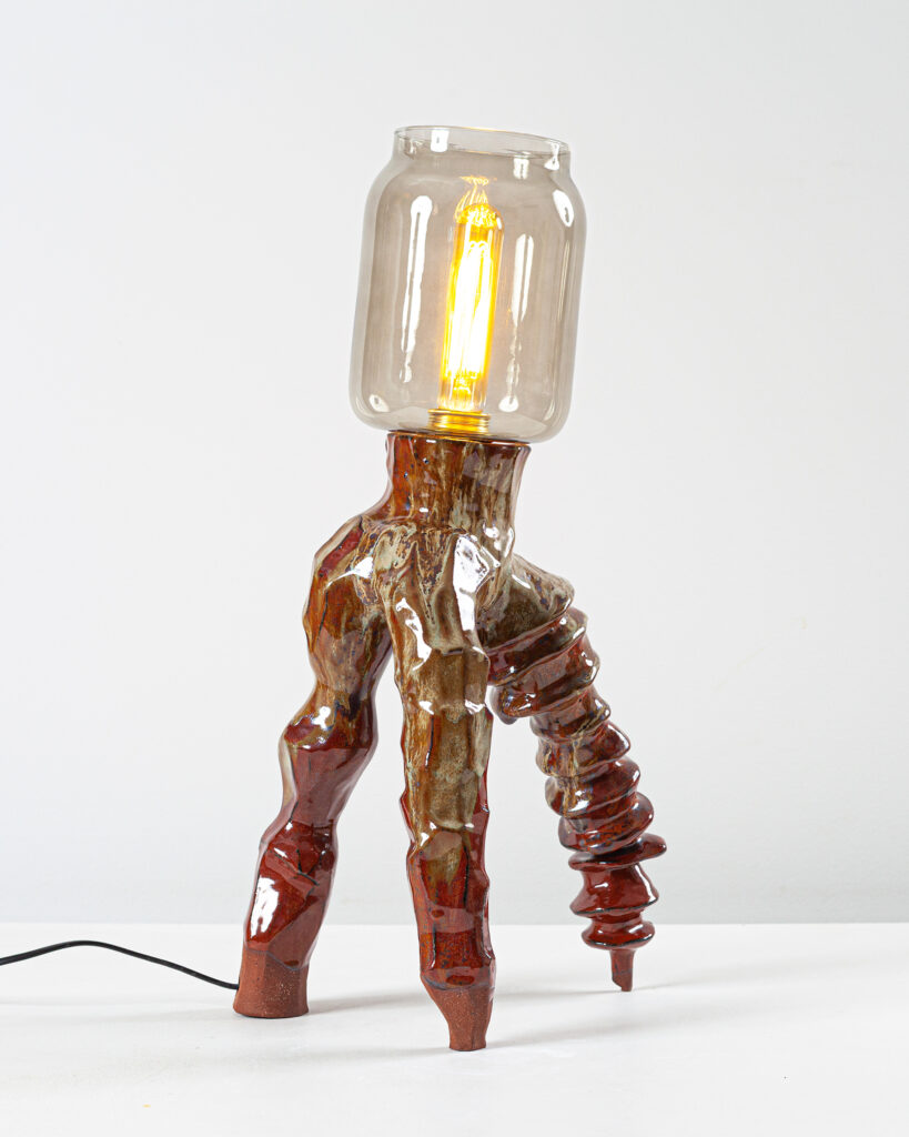 Isaia’s tripod lamps exist as acts of grounding. The third leg—solid and stable—becomes a trusted guide, allowing the form to stand after a long journey. Her glazed ceramic reflects time, while the light of recycled bulbs becomes living memory: a bridge between what was and what is still being built, between the past and a present searching for home.