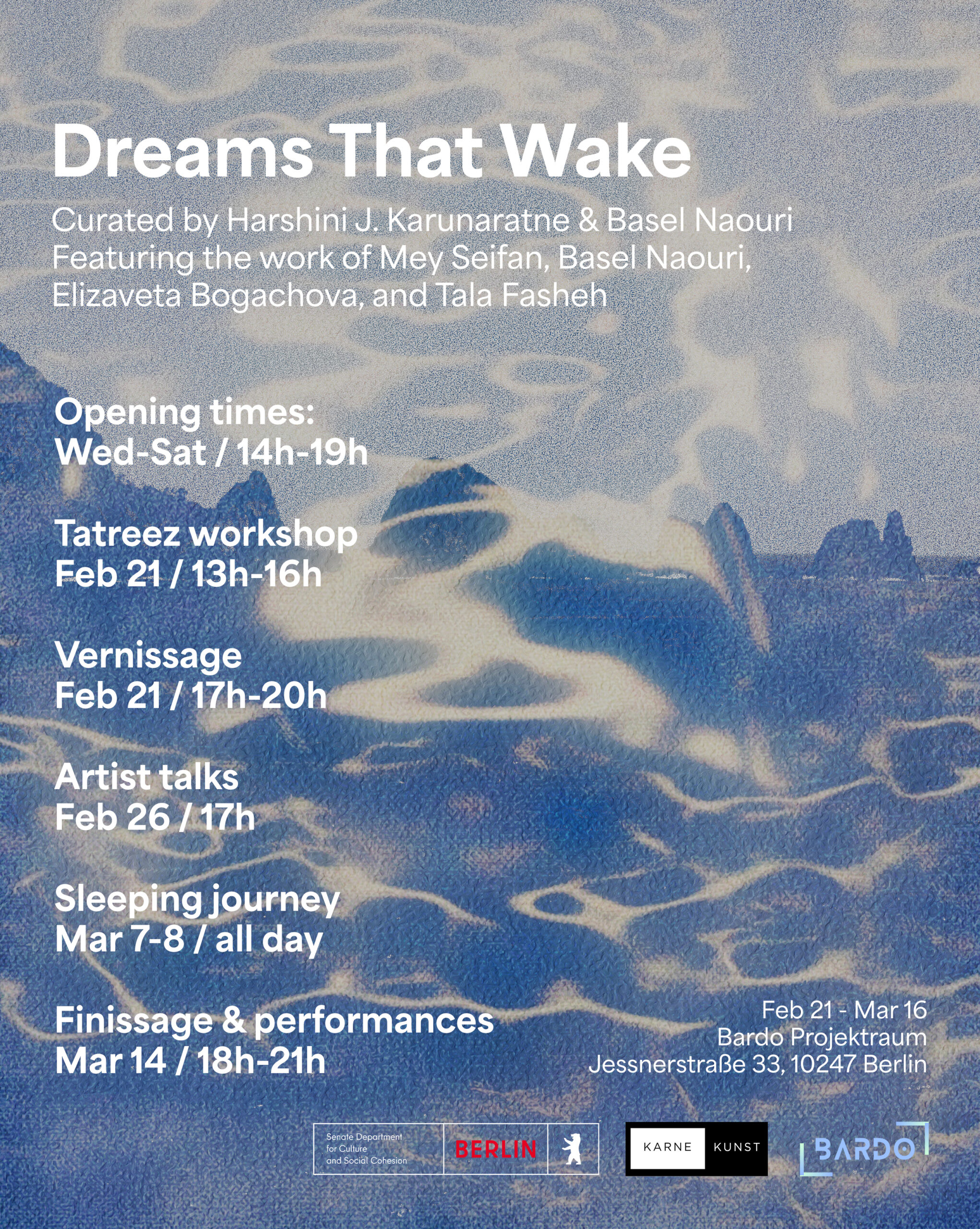 Dreams That Wake is curated by Harshini J. Karunaratne and Basel Naouri and is a Berlin-based project by Karne Kunst gUG, under the artistic direction of Marcela Villanueva.