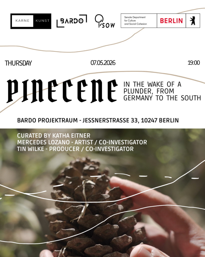 PINOCENO. Tras el rastro de un despojo, desde Alemania al Sur is a Berlin-based project by Karne Kunst gUG, under the artistic direction of Marcela Villanueva. Supported by the Senatsverwaltung für Kultur und Gesellschaftlichen Zusammenhalt des Landes Berlin and carried out at Bardo Projektraum, Berlin.